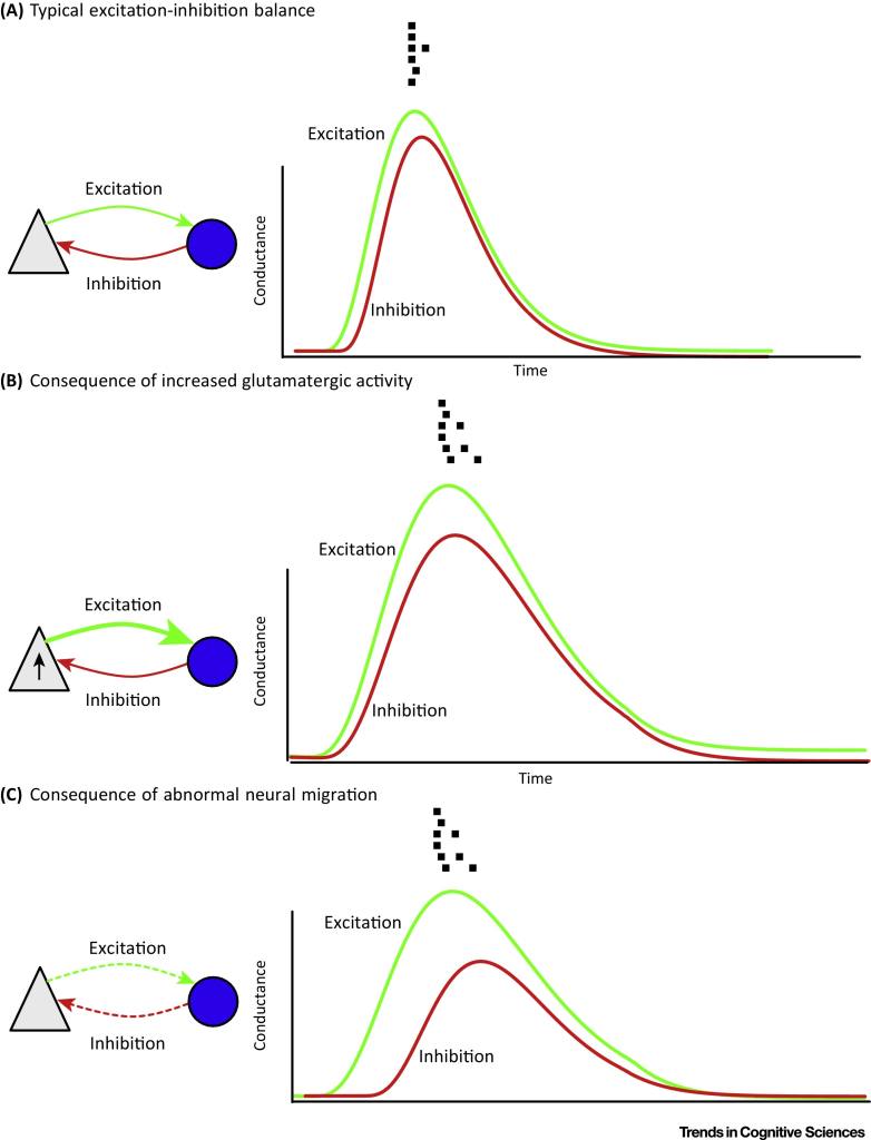 Disrupted neural migration: Both excitatory and inhibitory synaptic connections are required to maintain the E/I balance in local cortical circuits (local cortical circuits contain excitatory pyramidal neurons and inhibitory interneurons). Therefore, the authors report that the synaptic structure of a cortical microcircuit is important as it can determine its noise characteristics and therefore, any disruptions to the development of typical interconnections can lead to excess neural excitability (hyperexcitability) and result in increased neural noise in the brain. While we do not completely understand how disrupted neural migration associated with dyslexia risk genes affect the organization of cortical microcircuits, the authors claim that it is unlikely that the E/I balance is maintained in abnormally migrating circuits. Below is a figure that summarizes the proposals made by Hancock et al. (2017).